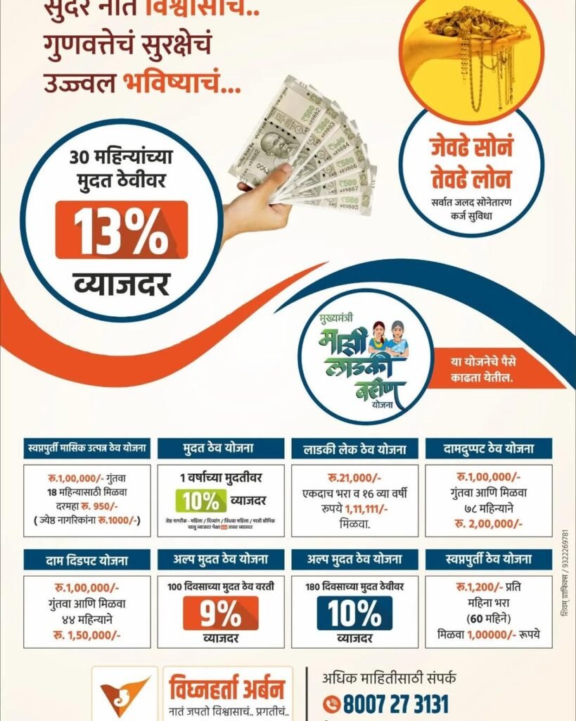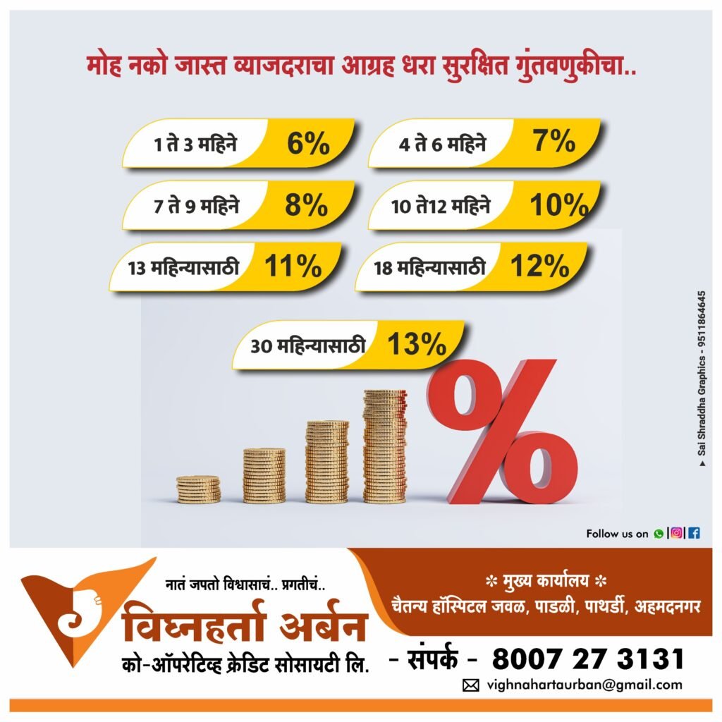 आमच्या ठेव योजना या सभासदांच्या आर्थिक सुरक्षिततेसाठी व भविष्यातील गरजा पूर्ण करण्यासाठी तयार करण्यात आल्या आहेत. आकर्षक व्याजदर व पारदर्शक व्यवहार ही आमची खास ओळख आहे.
